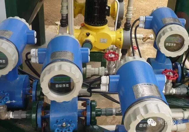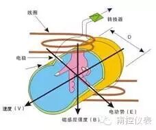 根据法拉第电磁感应原理,在与测量管轴线和磁力线相垂直的管壁上安装了一对检测电极,当导电液体沿测量管轴线运动时,导电液体切割磁力线产生感应电势,此感应电势由两个检测电极检出,数值大小与流速成正比例,其值为:E=B.V.E.K